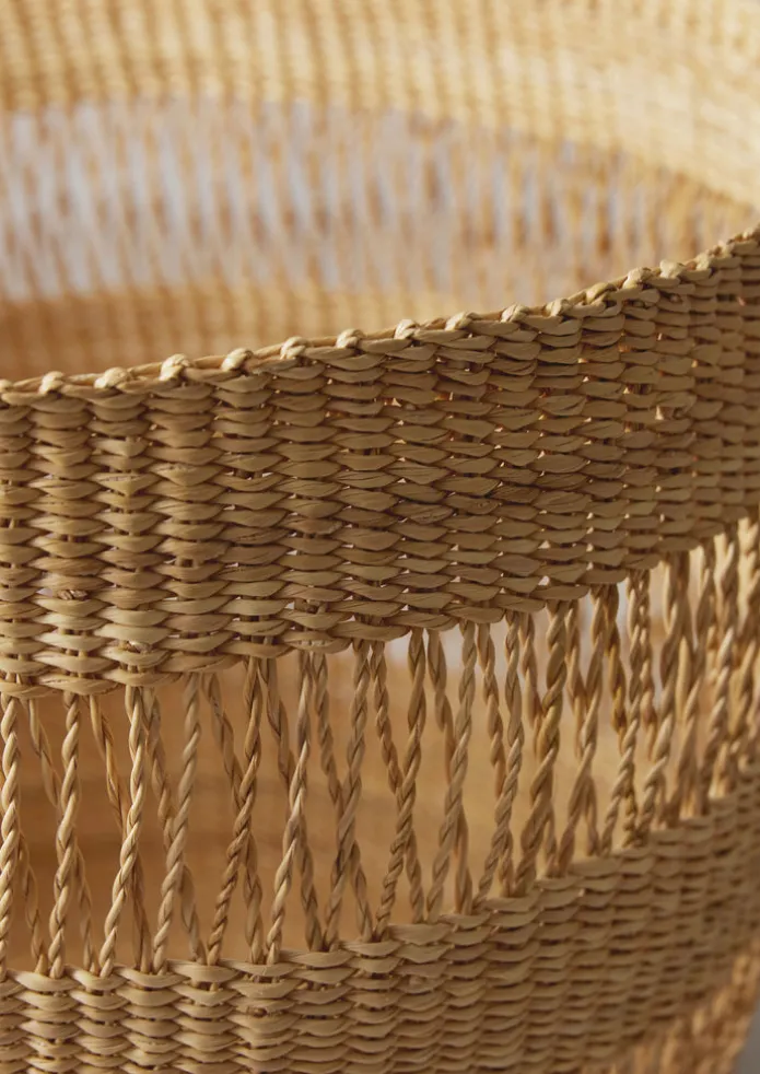 Open weave storage basket handwoven by artisans in Bolga, Ghana, supported by Frafra Baskets. Made from undyed Veta Vera grass which grows locally, also known as elephant grass. Shipped pressed inwards from the artisans in Ghana. To reshape it, simply sprinkle water on the entire basket, straighten it by hand and allow it to dry on a flat surface. Details Veta Vera glass. Brush clean. Spraying the basket with water every couple of years is recommended so it does not go brittle. The key is always make sure it dries well afterwards.Made in Ghana.Approx. D 35cm x H 28cm.
