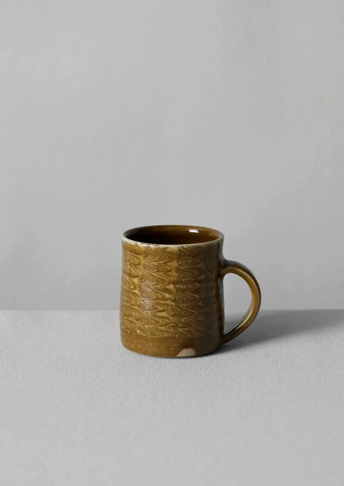 Hand-thrown mug with an undulating, rippled glaze by Lily Pearmain, a self-taught potter based in south-east London. Shaped from a blend of British stoneware clays with an elegant low handle. Lily creates the pattern using a percussion brush, creating wavy lines in the slip layer, then finishes with a transparent glaze. Each varies slightly in shape, pattern and colour. The finger marks are visible at the base, indicating where it has been held while dipping in the glaze. Details Hand wash. Stoneware. Made in the United Kingdom.Each ceramic piece has been thrown or pressed and glazed by hand. Due to the handmade nature, there may be pleasing variations and irregularities in colour, size and shape. Approx. H 9cm x D 8cm. 300ml.