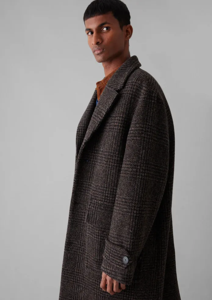 The Prince of Wales checked fabric making up our wool overcoat is woven in Italy. Accented by a revere collar and horn buttons, cut to a relaxed, single-breasted silhouette. Part of our Menswear collection. Italian-woven wool. Prince of Wales check. Revere collar. Internal hanging loop. Internal welt pocket. Patch and flap pockets. Fully lined. Back vent. Single-breasted front. Horn buttons. Details Dry clean only. 100% wool. Sleeve lining: 51% viscose, 49% cotton. Lining: 100% cotton. Made in Lithuania. Size & Fit Oversized. Length: Mid calf. Sleeve: Full length. Studio model Lohit is 6ft 2in/189cm tall and is wearing a size M.