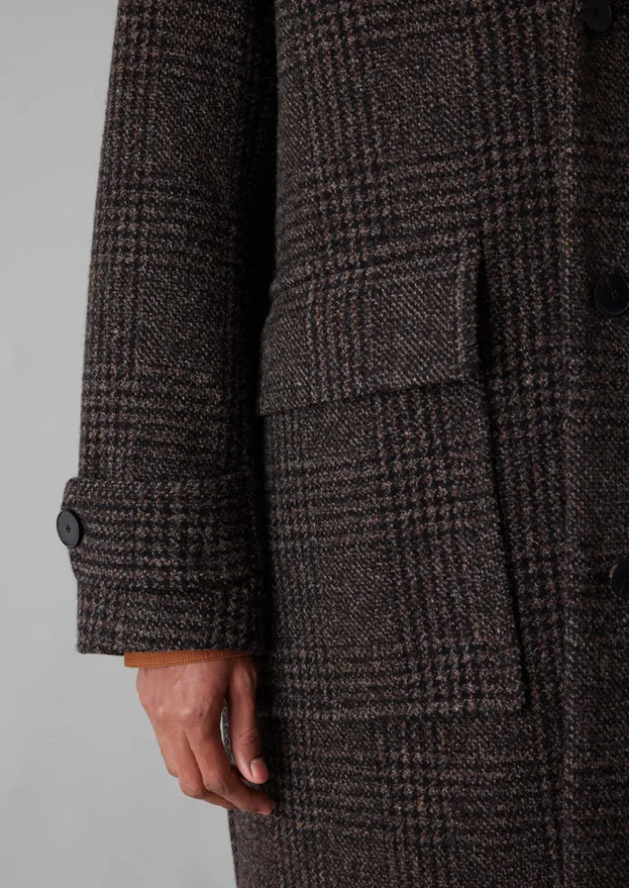 The Prince of Wales checked fabric making up our wool overcoat is woven in Italy. Accented by a revere collar and horn b…