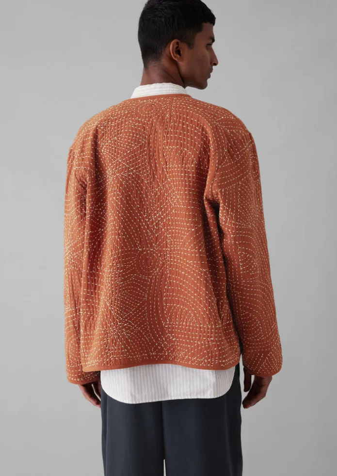 Like lines tracing a pathway, stitches have been intricately hand-embroidered on our kantha jacket. Cut to an easy shape, layers of cotton gauze brings softness and texture. It is then finished with a full lining in cotton. Part of our Menswear collection. Kantha-stitched. Drop shoulder. Cotton gauze wadding. Fully lined in cambric cotton. Side pockets. Slightly stepped hem. Corozo buttons. Details Dry clean only. 100% cotton. Embroidery: 100% recycled polyester. Made in India.Fine hand embroidery is very delicate. Please protect the item from jewellery or other sharp objects that may pull the threads. Size & Fit Easy fit. Length: Mid hip. Sleeve: Full length. Studio model Lohit is 6ft 2in/189cm tall and is wearing a size M.