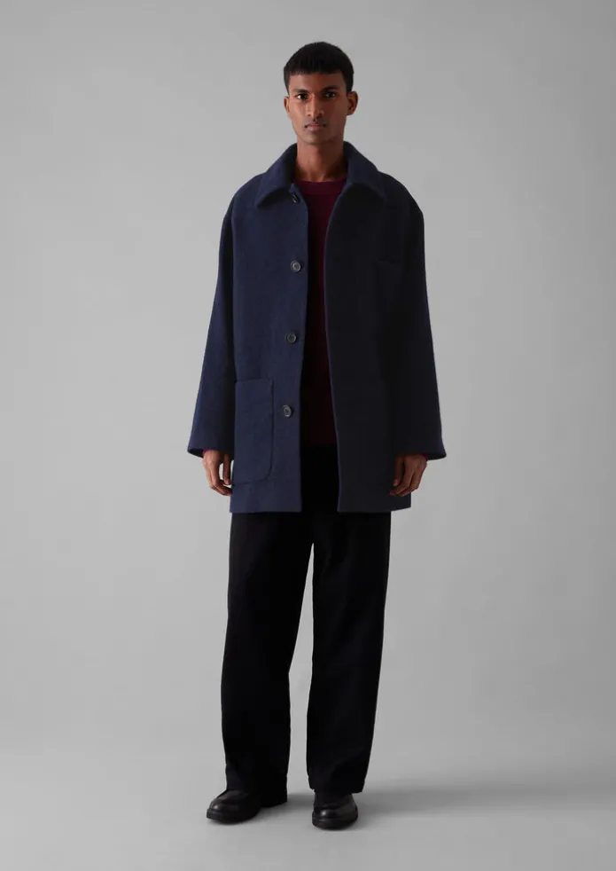 Our wool coat is crafted in east London by London Tradition from weighty wool which is woven in the UK. Cut to an easy shape with dropped shoulders, then finished with patch pockets. Part of our Menswear collection. Wool woven in the UK. Fully lined. Square collar. Internal hanging loop. Patch pockets. Horn buttons. Details Dry clean only. 100% wool. Lining: 100% cotton. Sleeve lining: 51% viscose, 49% cotton. Made in the United Kingdom. Size & Fit Oversized. Length: Low hip. Sleeve: Full length. Studio model Lohit is 6ft 2in/189cm tall and is wearing a size M.