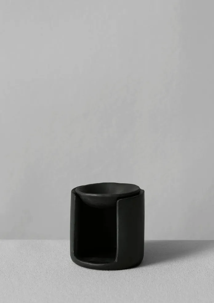 Hand-moulded oil burner for essential oils, with a small opening below for a tea light. Longpi pottery is an age-old technique unique to just two villages in north-east India. Made by mixing ground black stone with locally found clay, longpi pieces are characterised by a deep black patina, and the burnished finish creates a natural protective seal. Being handmade, each will vary slightly in shape and size. Simply place a few drops of essential oils in the small bowl on top with some water, then place a lighted tealight underneath. The steam created will fill the room with the relaxing aroma of the essential oils you choose. Always place your longpi oil burner on a protective surface away from other furnishings and handle with care, as it will get hot. Take caution near open flames and never leave burning candles unattended. Details Hand wash. Clay and stone.Made in India. Approximately 7.7 x 8.3cm.