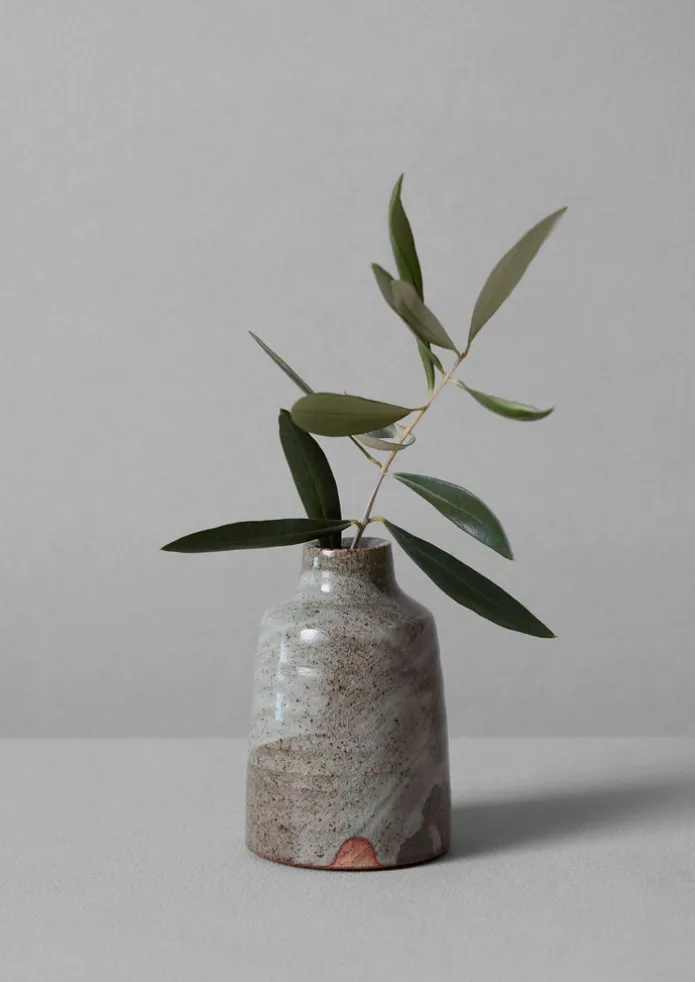 Bottle vase handcrafted by Bert Jones, a potter based just outside Newport, Wales. He works from a converted shipping container studio in the countryside. Hand-thrown from stoneware clay to a straight, tapered shape and finished with white slip brushstroke marks under a celadon glaze. The finger marks are visible at the base, indicating where it has been held while dipping in the glaze. Each varies slightly in shape and colour. Details Hand wash. Stoneware.Made in the United Kingdom.Each ceramic piece has been thrown or pressed and glazed by hand. Due to the handmade nature, there may be pleasing variations and irregularities in colour, size and shape.Approx. H 14cm x D 7cm.