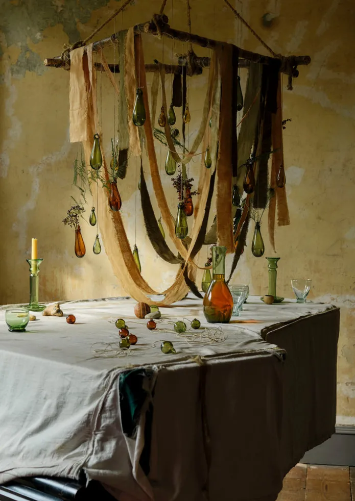 Made from recycled glass, hand-blown by master glass blowers in Syria, using an ancient and ancestral skill that has been passed down through many generations. Slight warps, marks and air bubbles make each piece unique and the colour may vary. Set of six with three large and three small baubles, suspended from jute string. Details Recycled glass.Made in Syrian Arab Republic.Small approx. H 7cm, large approx. H 11cm.Being entirely hand blown, each glass piece will vary slightly in thickness and size. There may be warps, bubbles and a slight roughness to the bases – which we like for the handmade feel.