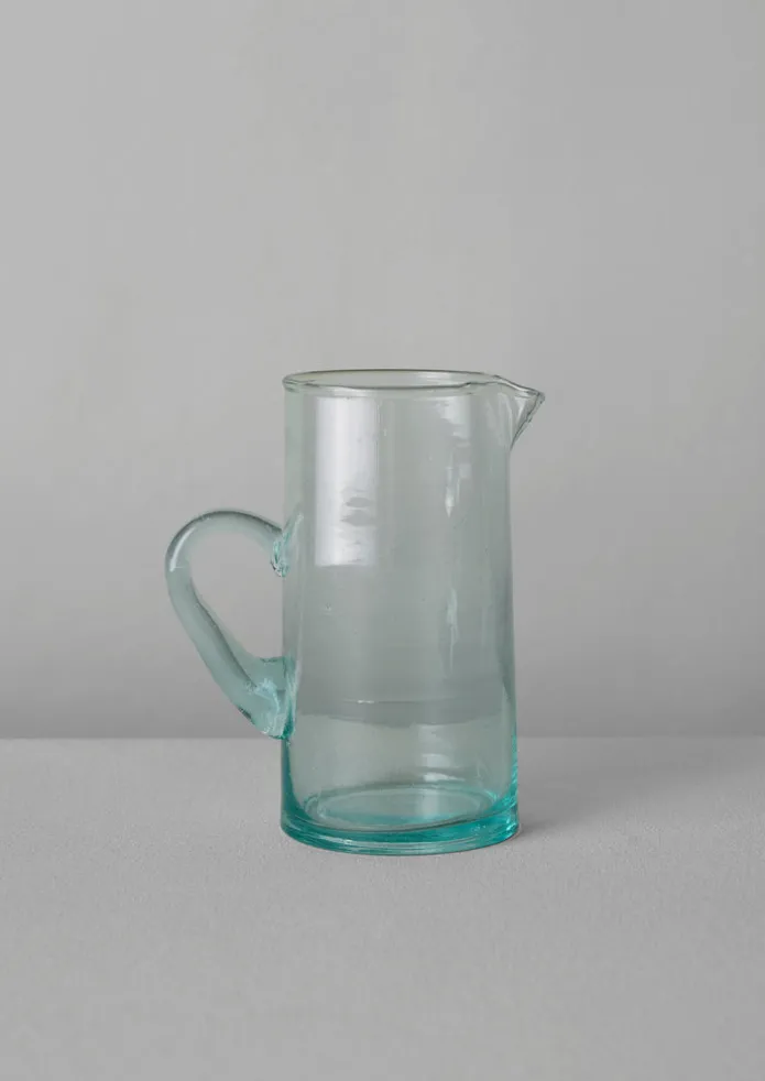 Glass jug hand-blown from recycled glass at the Beldi Country Club in Marrakesh. The group of 60 artisans are from the last glass factory in Morocco. They recycle two tons of glass a day with any waste from the process melted down again. Shaped with a lipped rim, rounded base and handle with thick walls, slight warps, marks and air bubbles, which are traces of the artisanal process. Details Hand wash. Recycled glass. Made in Morocco.Approx. H 19cm x D 8.5cm 1000ml.