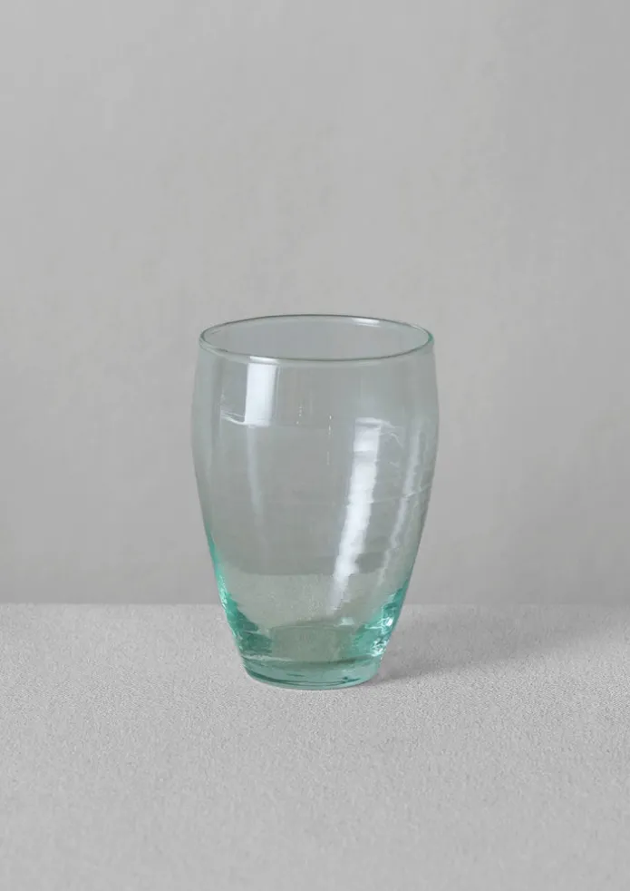 Set of six glasses hand-blown from recycled glass at the Beldi Country Club in Marrakesh. The group of 60 artisans are from the last glass factory in Morocco. They recycle two tons of glass a day, with any waste from the process melted down to be used again. Shaped to a rounded form with thick walls, slight warps, marks and air bubbles, which are traces of the artisanal process.DetailsHand wash. Glass.Made in Morocco. Approx. W 7cm x H 11cm.
