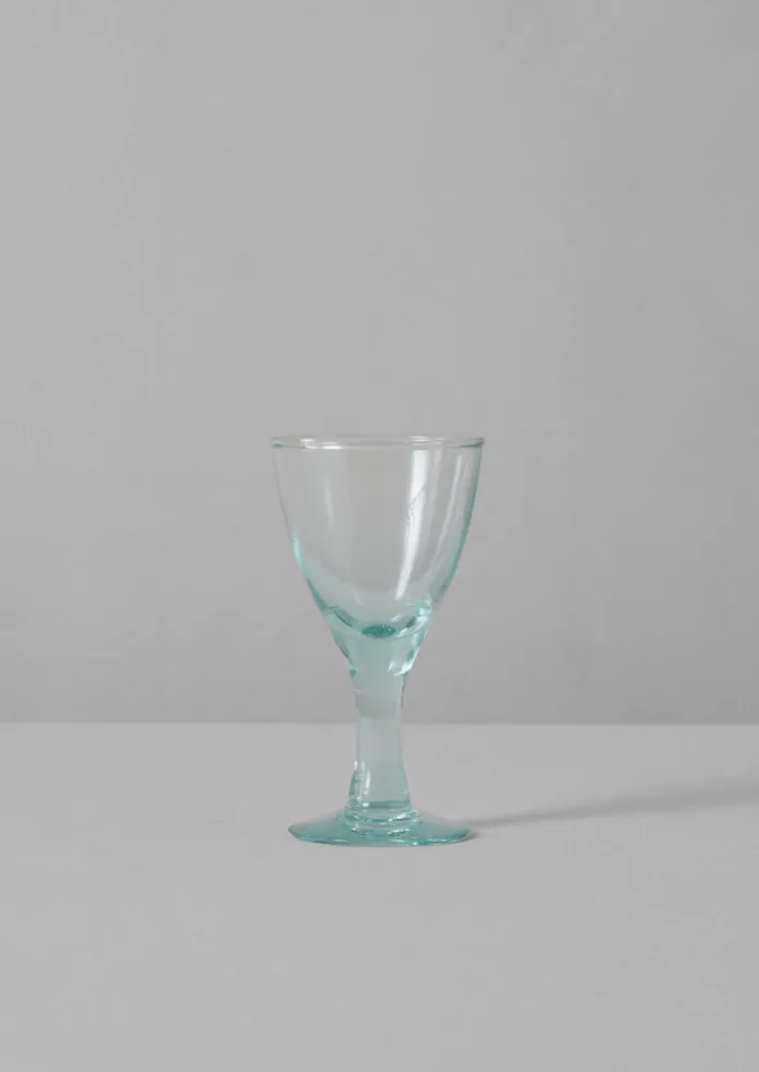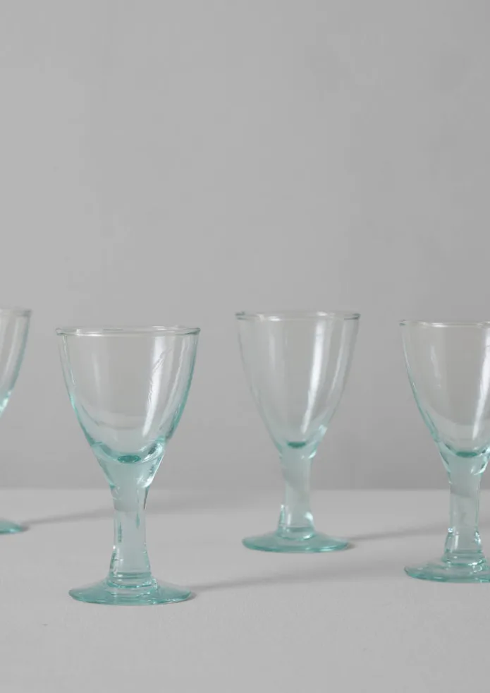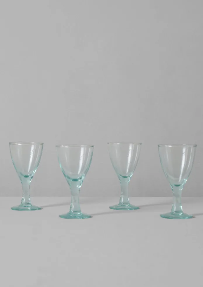 A set of four wine glasses made from 100% recycled glass. Crafted in a glass-making factory situated in Cochabamba, central Bolivia. May feature slight warps, marks and air bubbles, which are traces of the artisanal process.DetailsRecycled glassware. Dishwasher safe. Made in Bolivia.Approx. H15cm.