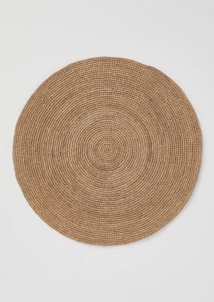Round raffia placemat hand-dyed and hand-crocheted in Madagascar from the natural fibres of the native raffia tree. The naturally strong raffia fibres are favoured for their soft, flexible and biodegradable qualities. Due to the hand-dye process the colour and tone will vary slightly from piece to piece. Details Sponge clean. Raffia. Made in Madagascar.Diameter 38cm.Hand crocheted raffia placemat – lightweight and flexible. Each individual mat is made in Madagascar from the natural fibres of the native raffia tree. The naturally strong raffia fibres are favoured for their soft, flexible and biodegradable qualities.