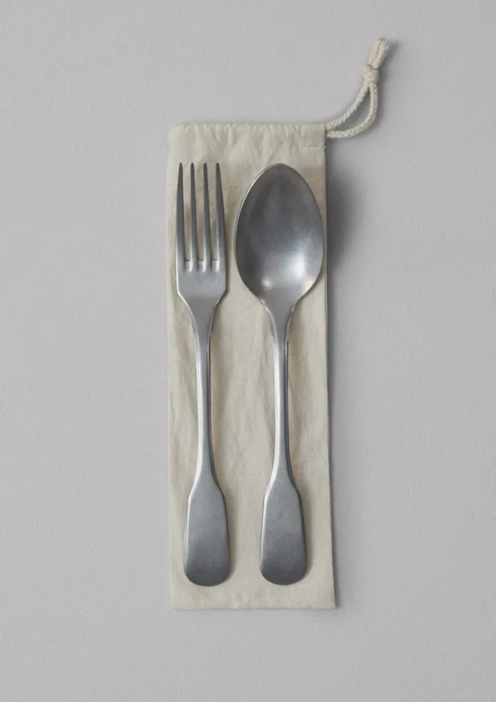 Weighty fork and spoon set, for serving. Crafted in Italy from stainless steel with a stonewashed finish. Accompanied by a cotton drawstring bag. Details Dishwasher safe. Stainless steel.Made in Italy.L 24.5cm.