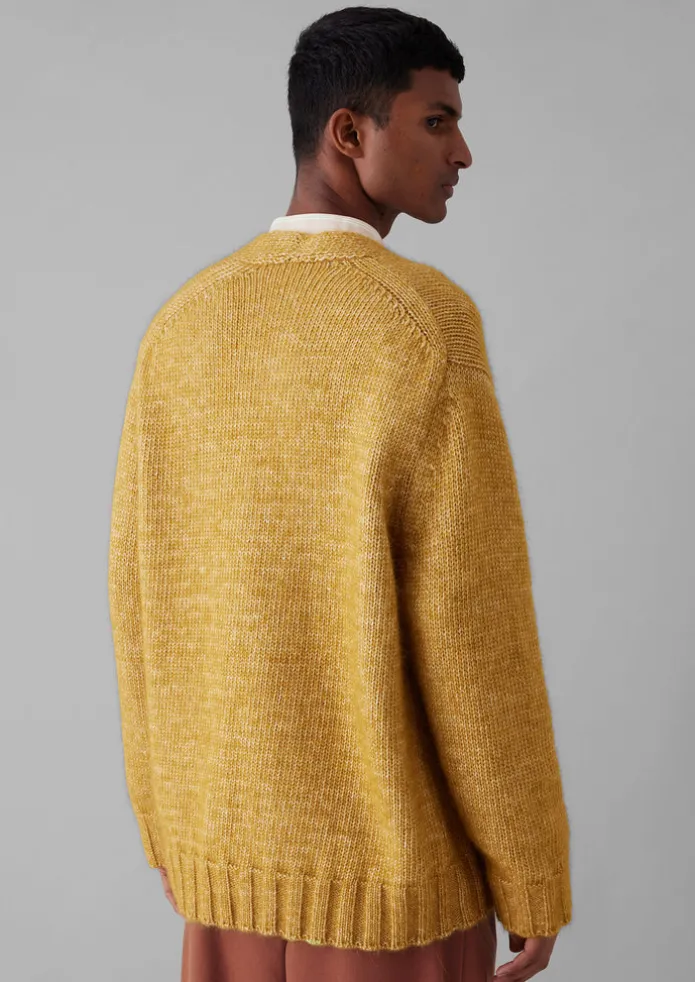 Knitted from melange alpaca wool and cotton for a fluffy tactile finish, our V-neck cardigan has dropped shoulders for a relaxed effect and is accented by corozo buttons. Part of our Menswear collection. Wool and organic cotton blend. V-neck. Side patch pockets. Dropped sleeves. Ribbed cuffs and hem. Horn buttons. Details Hand wash. Dry clean only. 62% cotton, 25% alpaca wool, 13% wool. Made in Italy.Soft yarns are liable to pill to some extent, even when using those of the best quality. To take good care of them remove any pills using a pilling comb and protect them from sharp items or jewellery that may catch or snag. Size & Fit Oversized. Length: Low hip. Sleeve: Full length. Studio model Lohit is 6ft 2in/189cm tall and is wearing a size M.
