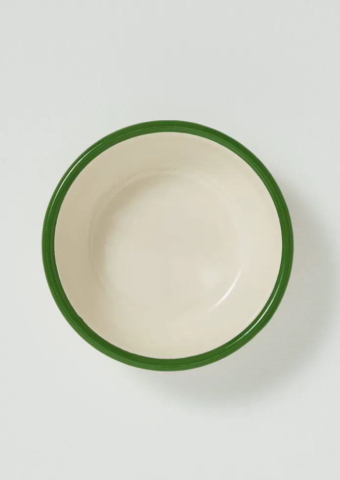 Traditional, durable and smooth, porcelain-infused enamel bowl for the kitchen, for camping, or as you will. With a contrasting colour rim and outer. For cereal or snacks such as chopped fruit. With a small amount of colour variation from batch to batch.If you drop enamelware, it may chip but it won’t break. If the outer porcelain layer chips, the steel beneath it naturally oxidises and the enamelware remains safe to use. Details Dishwasher safe. Enamel. Made in Turkiye. H 5cm x D 13cm.As our enamelware is handcrafted, there may be small black marks underneath the rim which are created by the tongs and hangers used during the firing process.