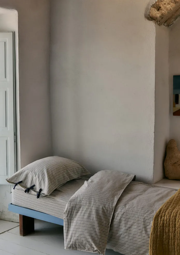 Traditional woven bed linen in soft, weighty, organic cotton with a classic pyjama stripe. Two rows of satin stitch along the edge of the sheet. Details Machine wash. 100% organic cotton.Made in India. To fit bed 135 x 190cm, mattress depth 28cm. To fit bed 150 X 200cm, mattress depth 28cm. To fit bed 180 x 200cm, mattress depth 28cm. 180 Thread Count.