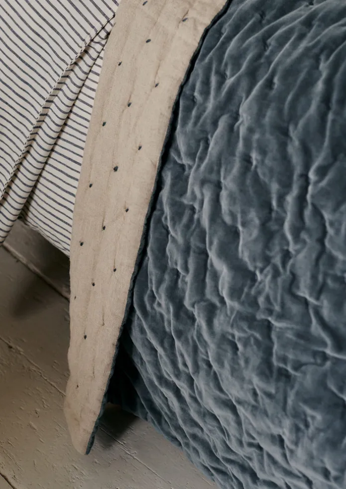 Warming throw crafted from soft and lustrous cotton velvet, then quilted by hand. Cosseting and quite weighty, with a sl…