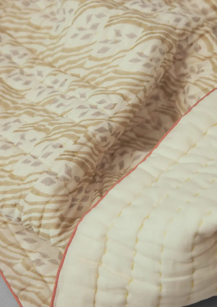 Soft cotton quilt hand block-printed by artisans in Jaipur. Filled with cotton wadding, then hand-stitched. With a plain…