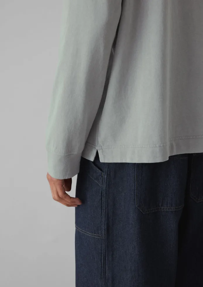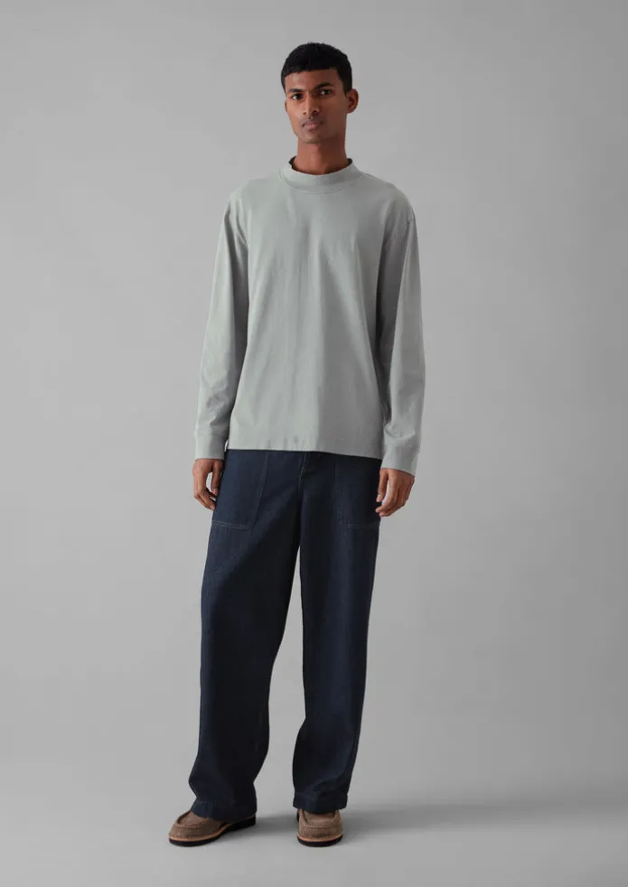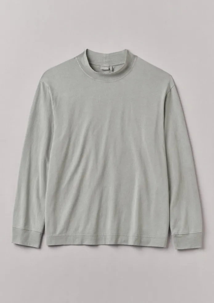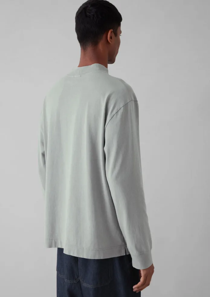 Our jersey cotton tee is garment-dyed, a process which gives each piece a unique texture and natural colour variation. Cut to a relaxed shape with a high neck and long sleeves for warmth. Part of our Menswear collection. Due to the mineral dye, each will naturally vary slightly in shade. Cotton jersey. Mineral-dyed. Garment-dyed. High neck with topstitching. Dropped sleeves. Side hem slits. Details Machine wash 30ºC. 100% cotton. Made in Portugal.Variations/unevenness of colour and gradual fading are characteristic of garment dyeing. The light coloured base of the fabric may show occasionally at stitching points, this should not be considered a defect. Size & Fit Oversized. Length: Mid hip. Sleeve: Full length. Studio model Lohit is 6ft 2in/189cm tall and is wearing a size M.