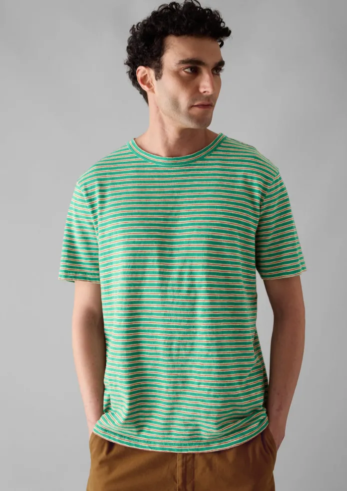 Our Theo tee is crafted in Portugal from slubby organic cotton jersey with wide yarn-dyed stripes. Shaped with a round n…
