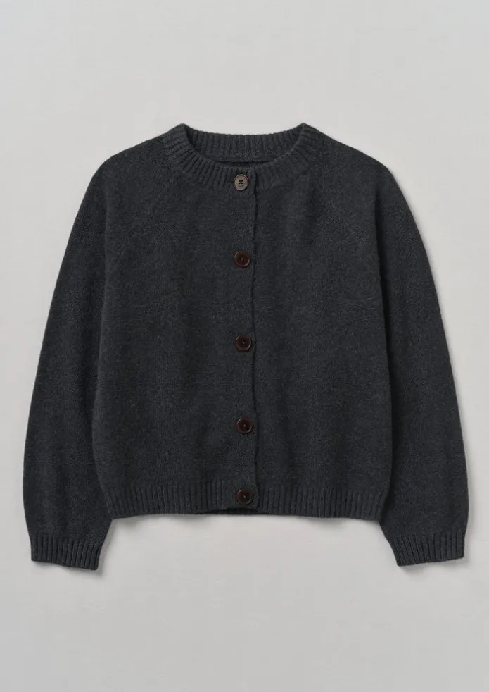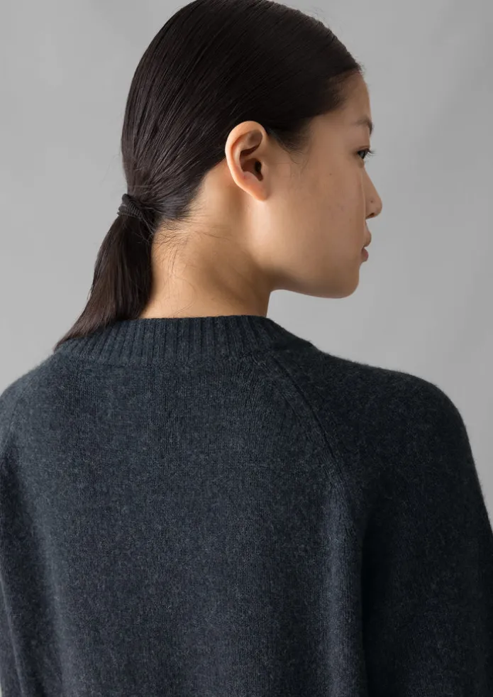 Considered shaping at the cuffs of our cardigan creates a rounded sleeve silhouette. Knitted from merino wool blended with recycled cashmere to an easy shape with a rounded ribbed neckline, then finished with large corozo buttons. Merino wool and recycled cashmere blend. Easy shape. Ribbed round neck. Raglan shoulders. Rounded wristbone-length sleeves. Integral ribbed edges. Mid-hip length. Corozo buttons. Details Hand wash. 70% wool, 30% cashmere.Made in China. Soft yarns are liable to pill to some extent, even when using those of the best quality. To take good care of them remove any pills using a pilling comb and protect them from sharp items or jewellery that may catch or snag. Size & Fit Easy fit. Length: Mid hip. Sleeves: Wristbone length. Neckline: Wide/open crew.Studio model Nova is 5ft 9in/175cm tall and is wearing a size S.