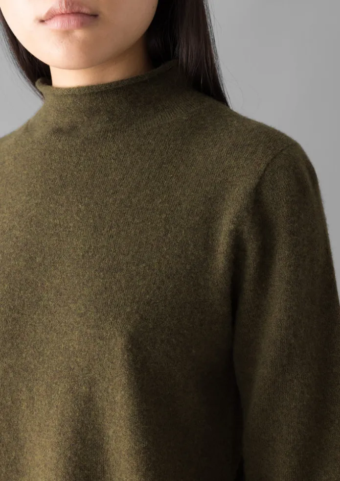 Our sweater is crafted from light wool blended with recycled cashmere for softness. Knitted without seams to an easy shape with a high rolled neckline, with sleeves falling to elbow length. Wool and recycled cashmere blend. Easy shape. Rolled high neck. Elbow-length sleeves. Mid-hip length. Integral ribbed cuffs and hem. Details Hand wash. 70% wool, 30% cashmere. Made in China.Made using recycled fibre.Soft yarns are liable to pill to some extent, even when using those of the best quality. To take good care of them remove any pills using a pilling comb and protect them from sharp items or jewellery that may catch or snag. Size & Fit Regular fit. Length: Mid hip. Sleeve: Elbow length. Neck: High neck.Studio model Nova is 5ft 9in/175cm tall and is wearing a size S.