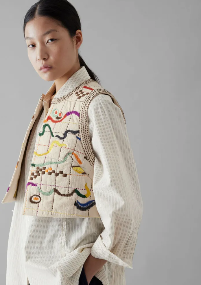 Our gilet is hand-embroidered with colourful threads by artisans in India. The abstract moon and flower motifs are reminiscent of vintage maps and charts. Layers of cotton muslin and recycled polyester wadding give the piece a soft and quilted quality. Hand-embroidered on cotton muslin. Recycled polyester wadding. Cotton lining. Side seams. Back neck darts. Details Dry clean only. Body: 100% cotton. Wadding: 100% recycled polyester. Body lining: 100% cotton. Embroidery: 100% recycled polyester.Made in India.Created using a combination of artisanal craft and modern techniques, in line with our vision to help preserve traditional methods.Fine hand embroidery is very delicate. Please protect the item from jewellery or other sharp objects that may pull the threads. Size & Fit Easy fit. Sleeve: Sleeveless. Studio model Nova is 5ft 9in/175cm tall and is wearing a size S.