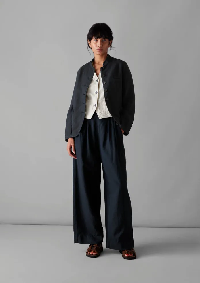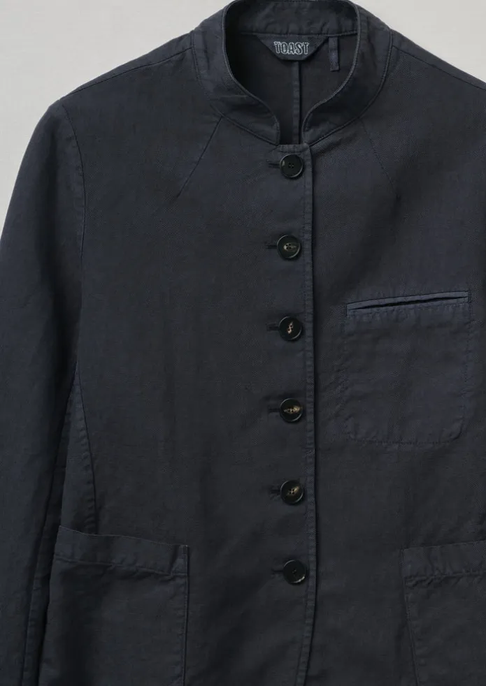 A jet pocket punctuates the chest of our pared-back jacket. Crafted from cotton and linen woven in Italy to a neat shape with a band collar and curved hem, then finished with an internal hanging loop. The jacket is garment-dyed, a process that gives each piece a washed, crumpled texture and natural colour variations. Cotton and linen blend. Garment-dyed. Band collar. Central back seam. Wristbone-length sleeves. Chest jet pocket. Side patch pockets. Curved hem. Internal hanging loop. Horn buttons. Details Machine wash 30ºC gentle cycle. 51% linen, 49% cotton.Made in Romania. Size & Fit Regular fit. Length: Low hip. Sleeves: Wristbone length.Studio model Anushka is 5ft 10in/178cm tall and is wearing a size 8.
