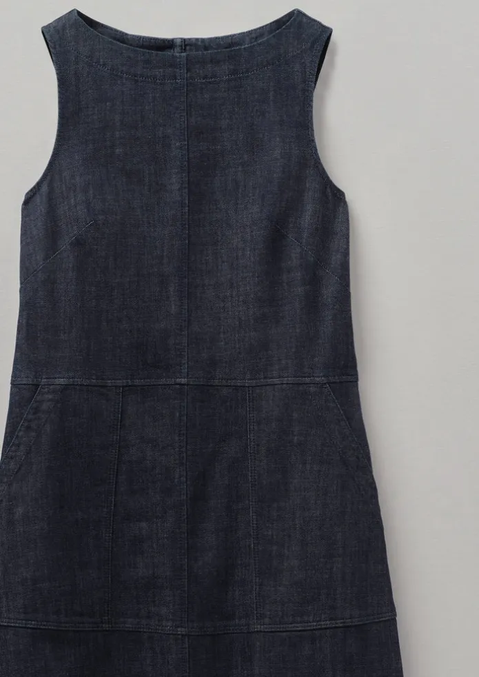 Our pinafore dress is crafted from denim woven from organic cotton, which is dyed with a technique that uses up to 70% less water than regular processes. With a panelled construction and large patch pockets, including one on the back. Organic cotton denim. Panelled construction. Large side patch pockets. Back patch pocket. Nape button. Details Machine wash 30ºC. 98% cotton, 2% elastane.Made in Turkiye. Size & Fit Regular fit. Length: Lower calf. Sleeves: Sleeveless.Studio model Maggie is 5ft 8in/172cm tall and is wearing a size 8.