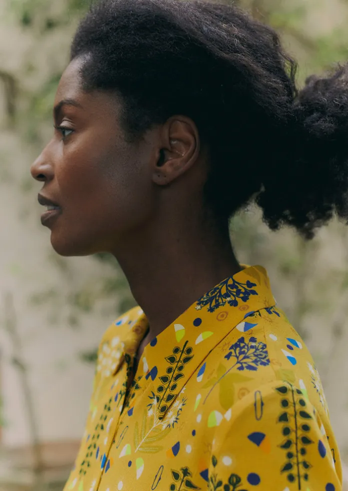 The collector print on our crepe dress is inspired by the botanical forms of contemporary artist Louise Despont. Cut to …