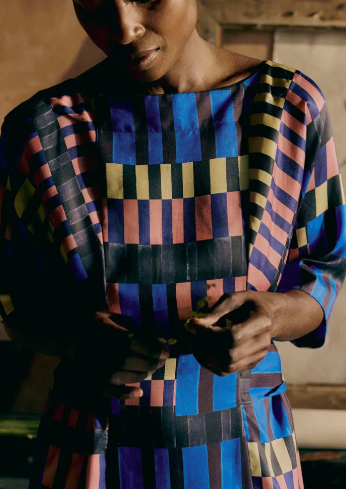 We have collaborated with British artist Isobel Harvey to create a check print inspired by the wings of her vivid bird paintings. Our dress is crafted from lyocell derived from wood pulp to a fluid shape with a wide tie to cinch the waist. Fluid lyocell twill. Digitally printed. Tie waist. Side-seam pockets. Lower-calf length. Details Machine wash 30ºC gentle cycle. 100% Lyocell. Made in China. Size & Fit Easy fit. Length: Lower calf. Sleeve: Elbow length. Studio model is 5ft 9in/175cm tall and is wearing a size .