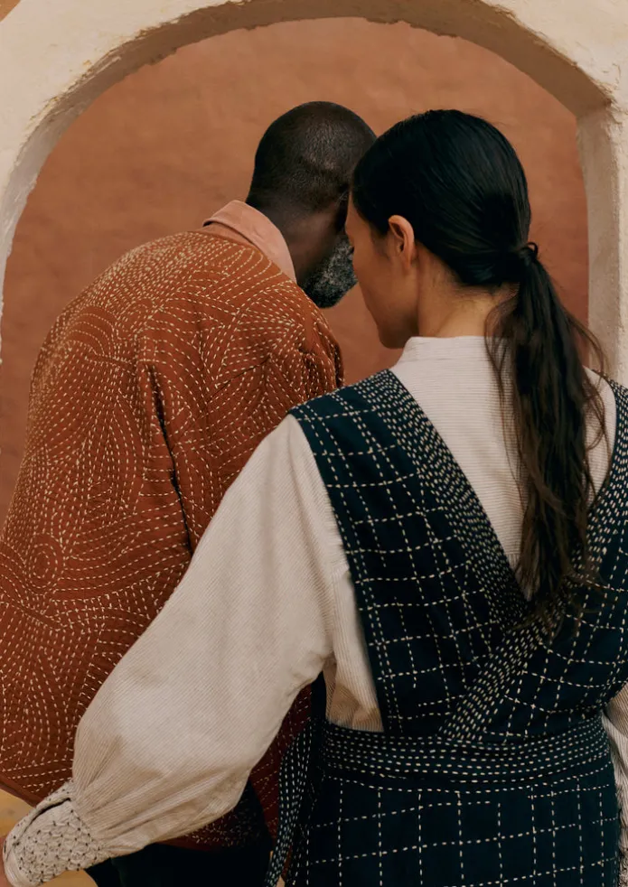 Our pinafore is hand kantha-stitched by artisan embroiderers in India in a pattern reminiscent of lines on a map. Crafte…