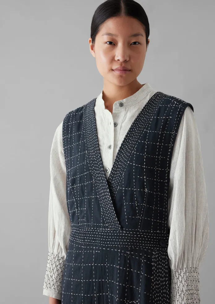 Our pinafore is hand kantha-stitched by artisan embroiderers in India in a pattern reminiscent of lines on a map. Crafted from crimped cotton and cut to a V-neck, then finished with a wrap front. Kantha-stitched. Crimped cotton. Side pockets. Waist darts. Wrap-around front. Details Dry clean only. 100% cotton. Embroidery: 100% recycled polyester. Made in India.Created using a combination of artisanal craft and modern techniques, in line with our vision to help preserve traditional methods.Fine hand embroidery is very delicate. Please protect the item from jewellery or other sharp objects that may pull the threads. Size & Fit Regular fit. Length: Mid calf. Sleeve: Sleeveless. Studio model Nova is 5ft 9in/175cm tall and is wearing a size 8.