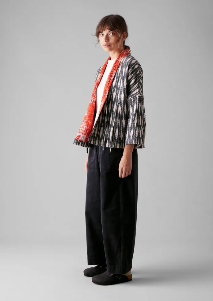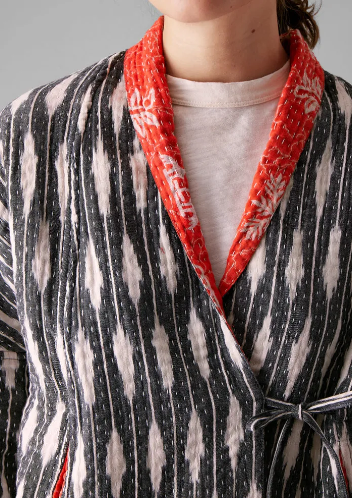 Our one-of-a-kind ikat jacket is kantha-stitched and sewn together from repurposed cotton saris by women in West Bengal …