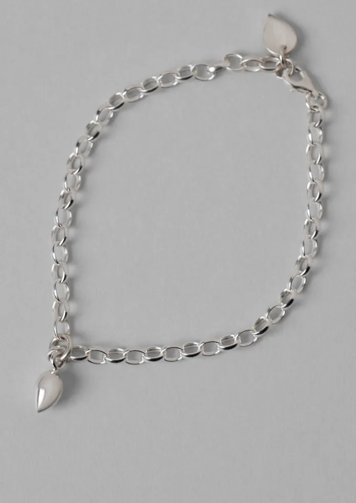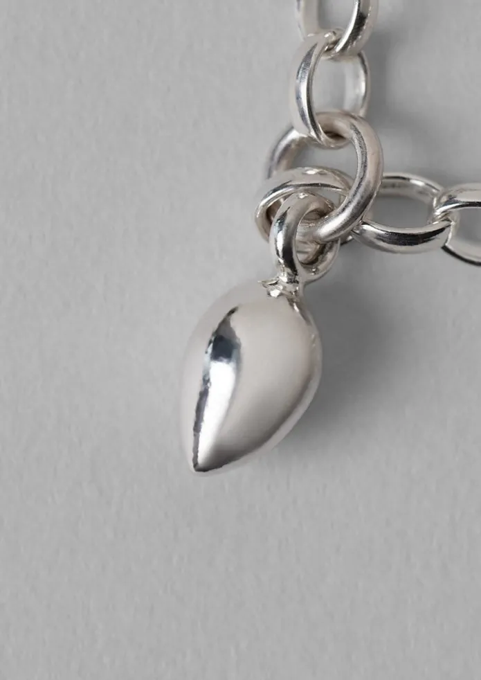 London-based jeweller Sally Lacock uses recycled sterling silver to create this Pod bracelet, which draws on botanical themes of growth, with a focus on renewal. Shaped to a chunky link chain with a smooth seed form drop and a domed leaf charm at the fastener. Recycled silver chain. Seed pod charm. Hallmarked fastener. Suitable for a variety of wrist sizes. Details Recycled 925 silver. Store in bag to avoid moisture. To remove a build up of tarnish gently clean with a silver polishing cloth.Made in the United Kingdom.Full length 20cm. Can be fastened on any link to suit wrist size.