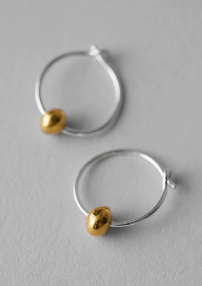London-based jeweller Sally Lacock uses recycled sterling silver to create these single Seed hoop earrings, which draws on botanical themes of growth, with a focus on renewal. Shaped to a slender hoop with a smooth charm plated with 24kt gold. Details Recycled 925 silver, 24kt gold plating. Store in bag to avoid moisture. To remove a build up of tarnish gently clean with a silver polishing cloth.Made in the United Kingdom.Hoop inside diameter approx. 15mm. Please note that earrings cannot be returned for reasons of health and hygiene.
