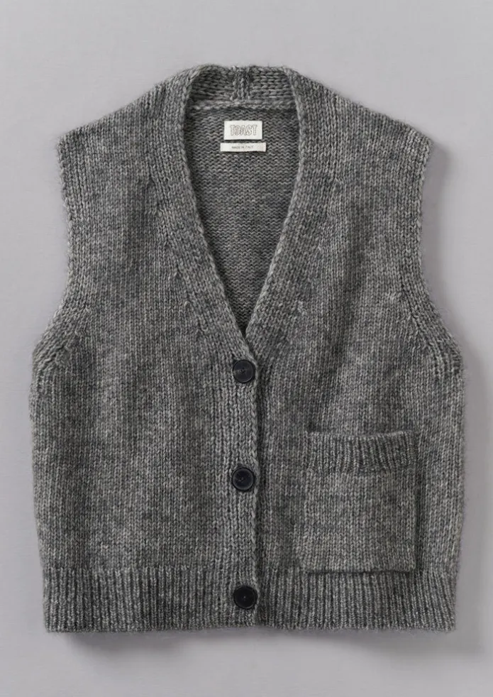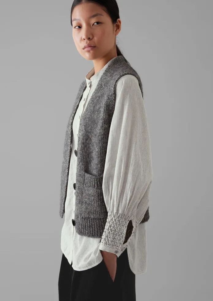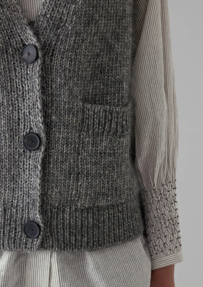 Our V-neck tank is knitted from a blend of alpaca, merino and cotton fibres for a lofty texture. Shaped to a mid-hip length and finished with a patch pocket and large corozo buttons. Alpaca, merino and cotton blend. V-neck. Mid-hip length. Integral ribbed edges. Corozo buttons. Details Hand wash. 62% cotton, 25% alpaca wool, 13% wool. Made in Italy.These cotton fibres have been grown in a chemical and pesticide free environment.Soft yarns are liable to pill to some extent, even when using those of the best quality. To take good care of them remove any pills using a pilling comb and protect them from sharp items or jewellery that may catch or snag. Size & Fit Regular fit. Length: Mid hip. Sleeve: Sleeveless. Neck: V neck. Studio model Nova is 5ft 9in/175cm tall and is wearing a size S.