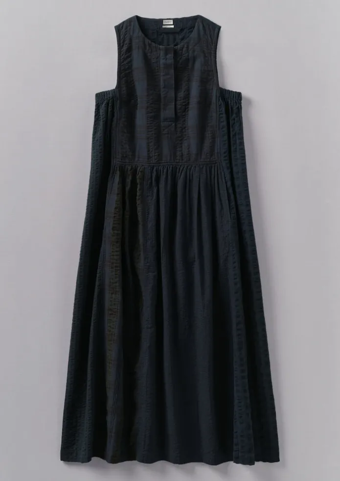 Our limited edition dress features skirt side panels and gathers for subtle volume. Crafted from deadstock checked seersucker cotton fabrics that have been overdyed for depth of colour. With a round neckline and elasticated underarm facing panel, falling to an easy shape. Seersucker overdyed cotton. Easy shape. Sleeveless. Low arm holes. Round neckline. Skirt panels. Hanger loop. Details Machine wash 30ºC gentle cycle. 100% cotton. Made in India.There may be some colour rub, so please keep away from light coloured fabrics and upholstery. Size & Fit Regular fit. Length: Lower calf. Sleeve: Sleeveless. Studio model Nova is 5ft 9in/175cm tall and is wearing a size S.