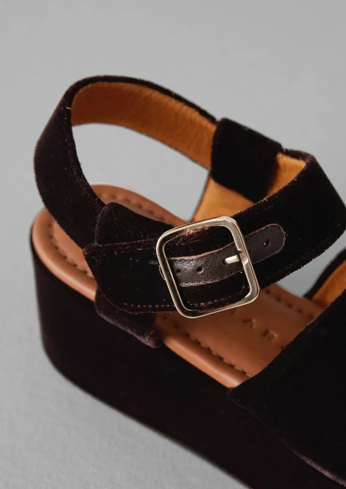 Leather platform shoes handmade in Spain by Chie Mihara. Shaped with an open toe, a buckled ankle strap and a chunky wedge platform set on a leather and rubber sole. Soft velvet. Buckled ankle strap. Peep toe. Chunky wedge platform. Leather and rubber sole. Details Velvet upper, TPU sole. Made in Spain.Heel height 60mm x 40mm.