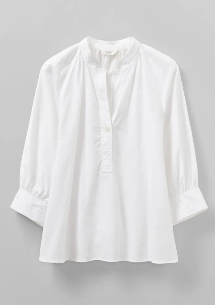 Our effortless shirt is crafted from soft, lightweight cotton oxford which is comfortable against the skin. Shaped with a band collar and raglan sleeves, with delicate gathers for a feminine note. Lightweight cotton oxford. Band collar. Raglan sleeves. Gathered cuffs. Side hem slits. Corozo buttons. Details Machine wash 30ºC. 100% cotton.Made in India. Size & Fit Easy fit. Length: Mid hip. Sleeves: 3/4 length.Studio model Nova is 5ft 9in/175cm tall and is wearing a size S.