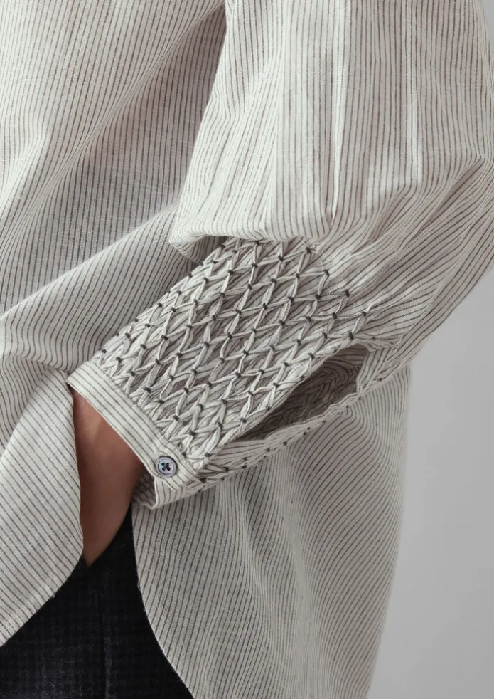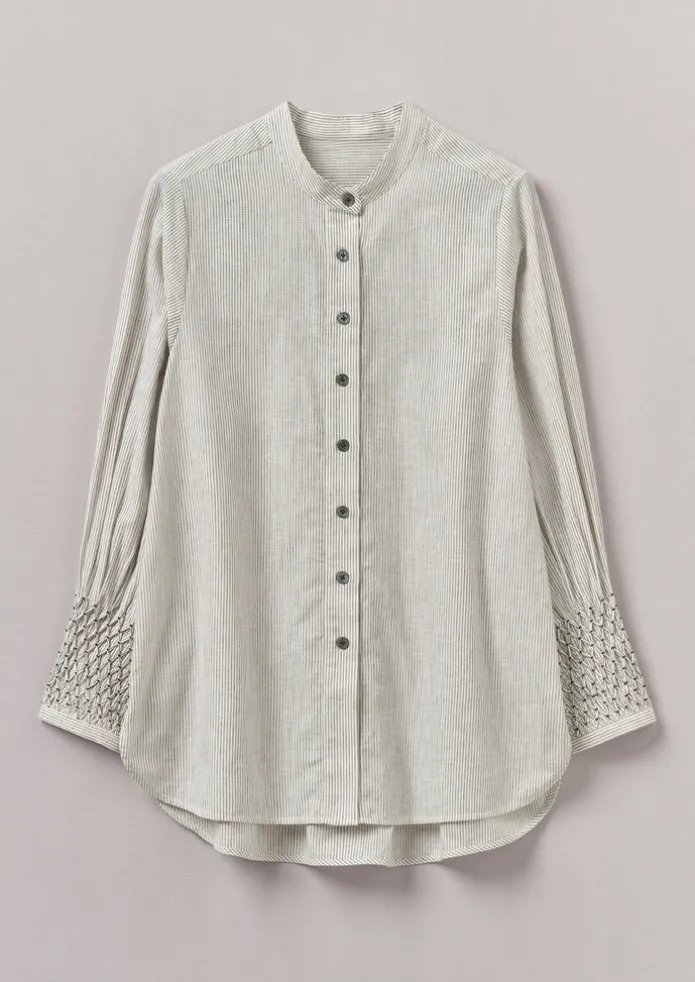 Our shirt is crafted from a slubby cotton and linen fabric for texture, woven with a stripe. The cuffs are delicately hand-smocked by Indian artisans and finished with a step hem. Cotton and linen stripe. Hand-smocked. Back yoke. Gathered buttoned cuffs. Side hem slits. Low-hip length. Step hem. Mother-of-pearl buttons. Details Hand wash. 84% cotton, 16% linen. Embroidery: 100% recycled polyester. Made in India.Created using a combination of artisanal craft and modern techniques, in line with our vision to help preserve traditional methods.Fine hand embroidery is very delicate. Please protect the item from jewellery or other sharp objects that may pull the threads. Size & Fit Regular fit. Sleeve: Wristbone length. Studio model Nova is 5ft 9in/175cm tall and is wearing a size 8.