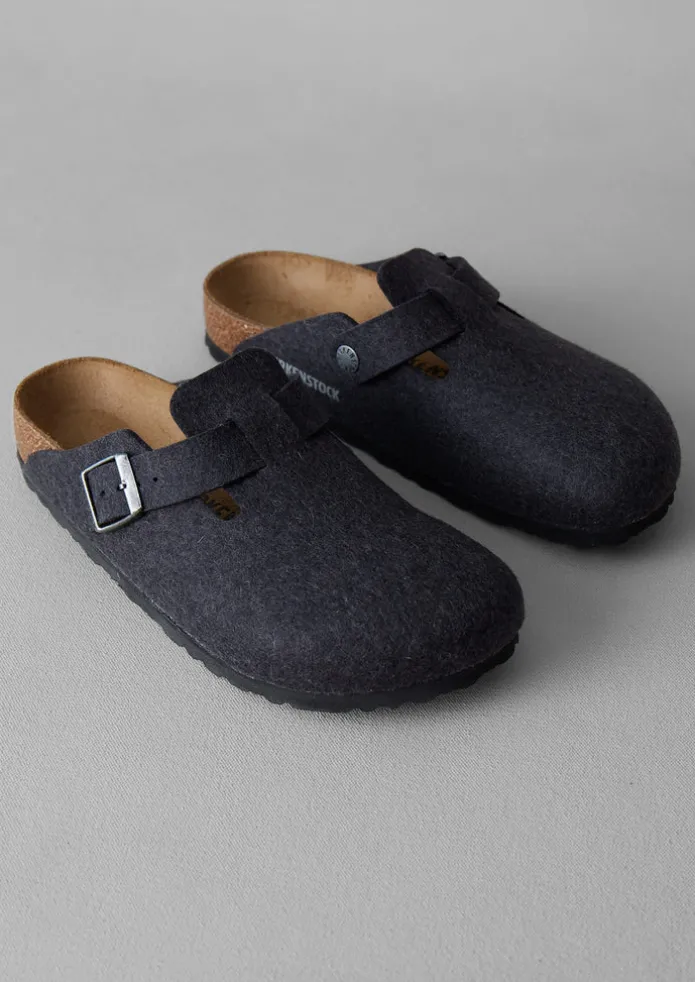 Comfortable Boston clogs, a signature style by Birkenstock, introduced in 1979. Crafted in Germany from soft wool felt to a round-toe shape, then set on a moulded cork footbed for comfort throughout the day. Wool felt. Round toe. Logo-engraved metal buckle. Cork footbed. EVA sole. Narrow fit. Details Wool felt upper cork insole and EVA sole. Made in Germany.Heel height 1cm.